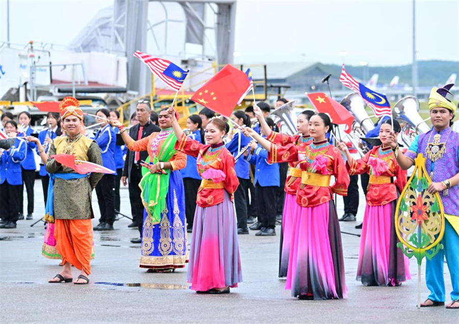 Chinese President Xi Jinping is warmly welcomed by Malaysian Prime Minister Anwar Ibrahim and other senior officials at Kuala Lumpur International Airport in Kuala Lumpur, Malaysia, April 15, 2025. Xi arrived in Kuala Lumpur on Tuesday to pay a state visit to Malaysia at the invitation of King of Malaysia Sultan Ibrahim. [Xinhua/Li Xueren]