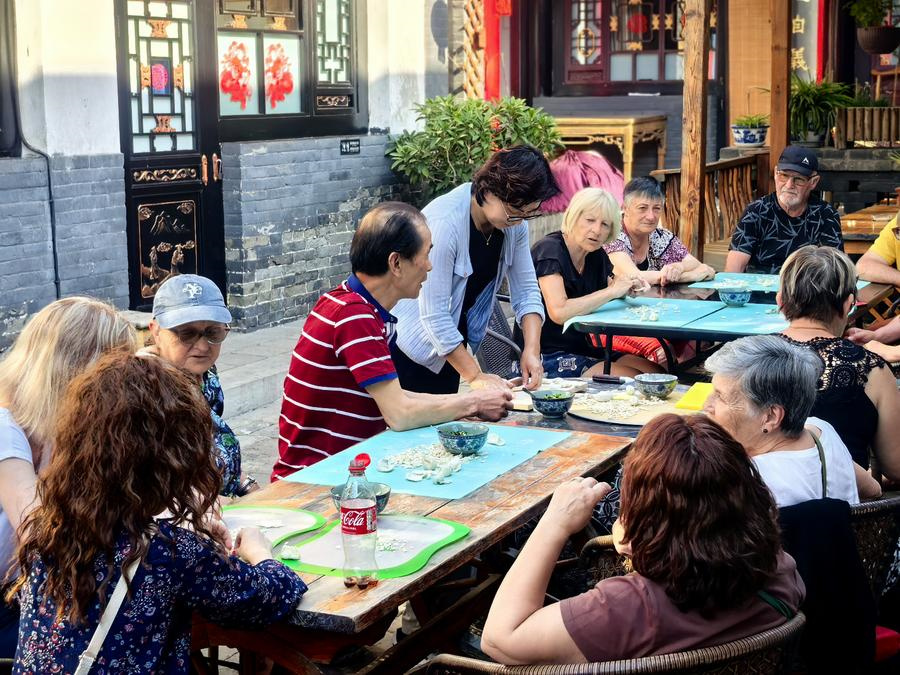 Foreign tourists learn to make traditional wheaten food at a homestay in Pingyao, north China's Shanxi Province, May 15, 2025. [Photo by Qiao Yan/Xinhua]