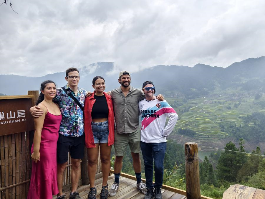 Tom Peacock-Nazil (2nd R) and other tourists pose for a photo in Leishan County, southwest China's Guizhou Province, in September 2024. [China Explorer Tour/Handout via Xinhua]