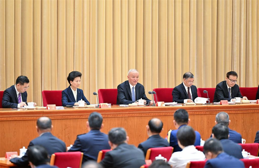 Cai Qi, a member of the Standing Committee of the Political Bureau of the Communist Party of China (CPC) Central Committee and a member of the Secretariat of the CPC Central Committee, attends a national conference honoring champions of cultural and ethical progress in Beijing, capital of China, May 23, 2025. An important instruction by Chinese President Xi Jinping, also general secretary of the CPC Central Committee and chairman of the Central Military Commission, was conveyed at the conference. [Xinhua/Zhai Jianlan]