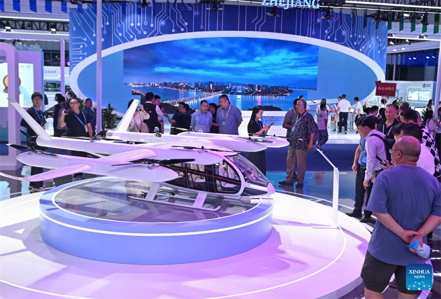 People view an aircraft model at the pavilion of Sichuan Province at the 20th Western China International Fair in Chengdu, southwest China's Sichuan Province, May 25, 2025. The fair opened in Chengdu on Sunday under the theme of "Deepen Reform For More Momentum, Expand Openness for Greater Growth." The fair, which is hosted by the People's Government of Sichuan Province, has attracted over 3,000 enterprises from home and abroad, and will last until May 29.