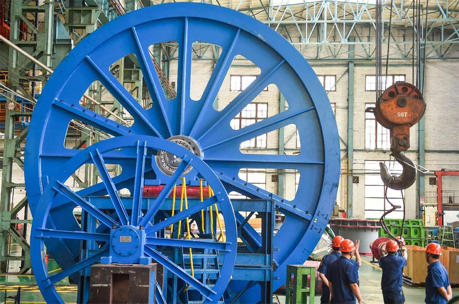 In the assembly workshop of CITIC Heavy Industries Co., Ltd. in Luoyang, central China's Henan province, workers are assembling mine hoist sheaves and other mining equipment bound for overseas markets. [Photo by Huang Zhengwei/People's Daily Online]