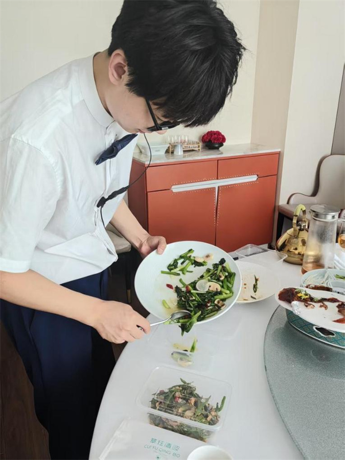 A staff member helps customers pack the leftover food at a restaurant in Xiqing District of north China's Tianjin, June 8, 2025. [Xinhua]