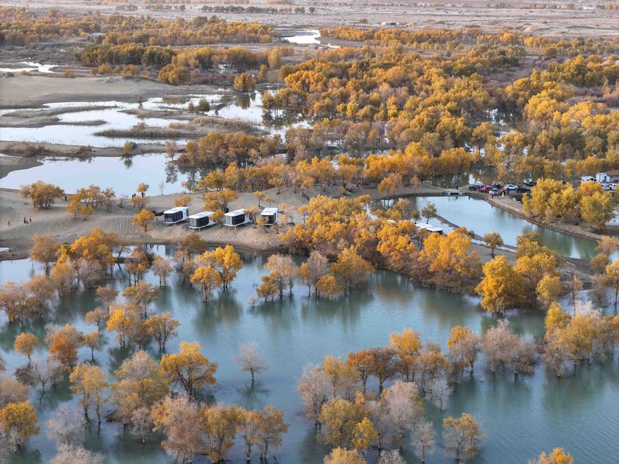 An aerial drone photo taken on Oct. 25, 2024 shows the autumn scenery of the desert poplar forest at the Huludao (Gourd Island) scenic spot in Yuli County, northwest China's Xinjiang Uygur Autonomous Region. [Xinhua/Hu Huhu]