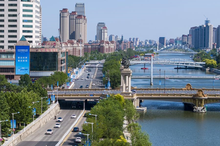An aerial drone photo taken on June 21, 2025 shows a poster of the 2025 Summer Davos hung on a building along the Haihe River in Tianjin Municipality, north China. [Xinhua/Zhao Zishuo]
