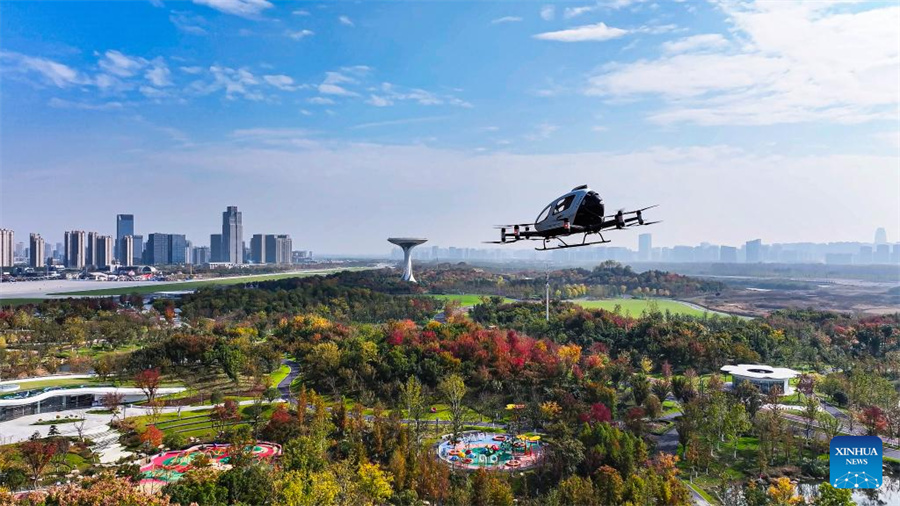 In recent years, Hefei has been vigorously developing low-altitude economy and continuously enrich related consumption scenarios. It has launched over 100 low-altitude service routes including sightseeing, medical supplies delivery, takeout delivery, rail track patrol, power line patrol, and fire-safety patrol. [Xinhua/Liu Junxi]