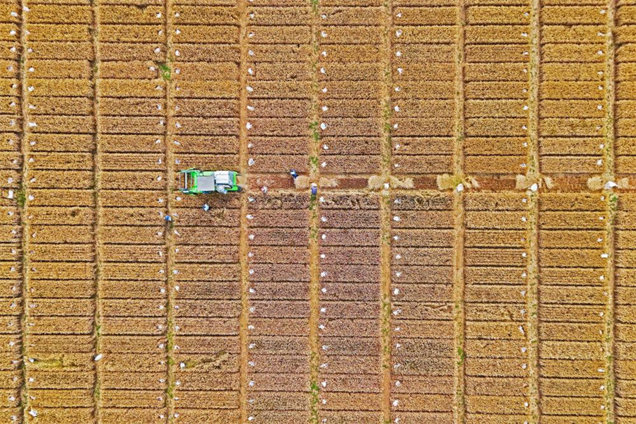 An aerial drone photo taken on June 18, 2025 shows a harvester working in an experimental field in Yantai City, east China's Shandong Province. [Photo by Sun Wentan/Xinhua]