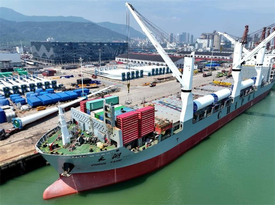 Wind power equipment are loaded onto a cargo ship for export in Lianyungang, east China's Jiangsu province, June 23, 2025. [People's Daily Online/Wang Chun]